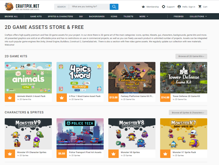 특정 컨셉의 게임을 만들 수 있게 리소스를 통째로 제공하는 Kit 종류도 많아서 그래픽의 통일성 갖추기가 쉽다.