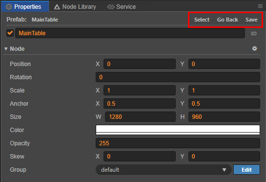 유니티의 Select, Revert, Apply에 대응하는 Select, Go Back, Save 버튼이 있다.
