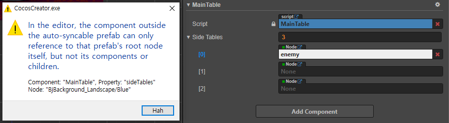 오류 내용에서 설명하듯, auto-syncable 내의 자식 노드는 프로퍼티로 참조할 수 없지만 root 노드는 참조할 수 있다.