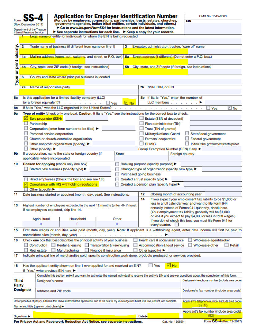 문제는 이걸 완성하기 위해선 'EIN'이라는 미국 국세청에서 발급해주는 신원 확인 번호가 있어야한다는 거지 (노란 칸)