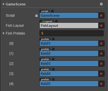 물고기들의 부모 노드가 될 레이아웃, 생성할 물고기들의 프리팹 리스트를 연결해준다.