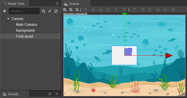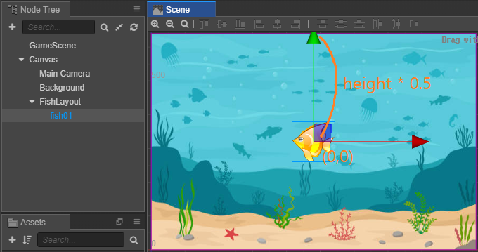 FishLayout에 물고기 하나를 놓아보면 (0,0) 좌표는 화면 중앙이라는 것을 알 수 있다.